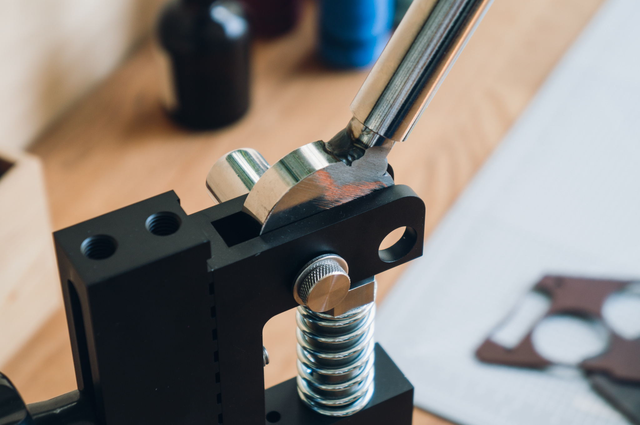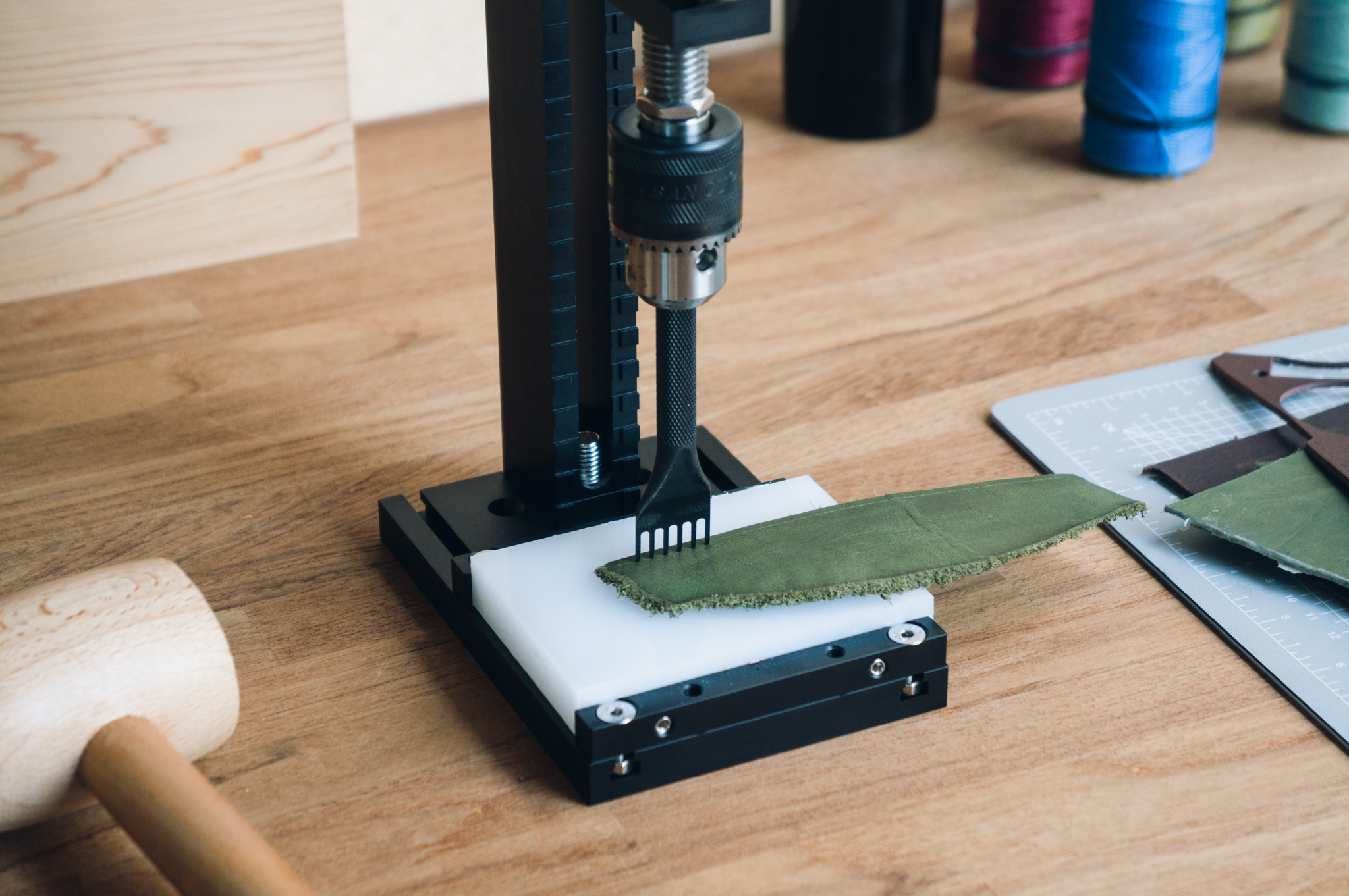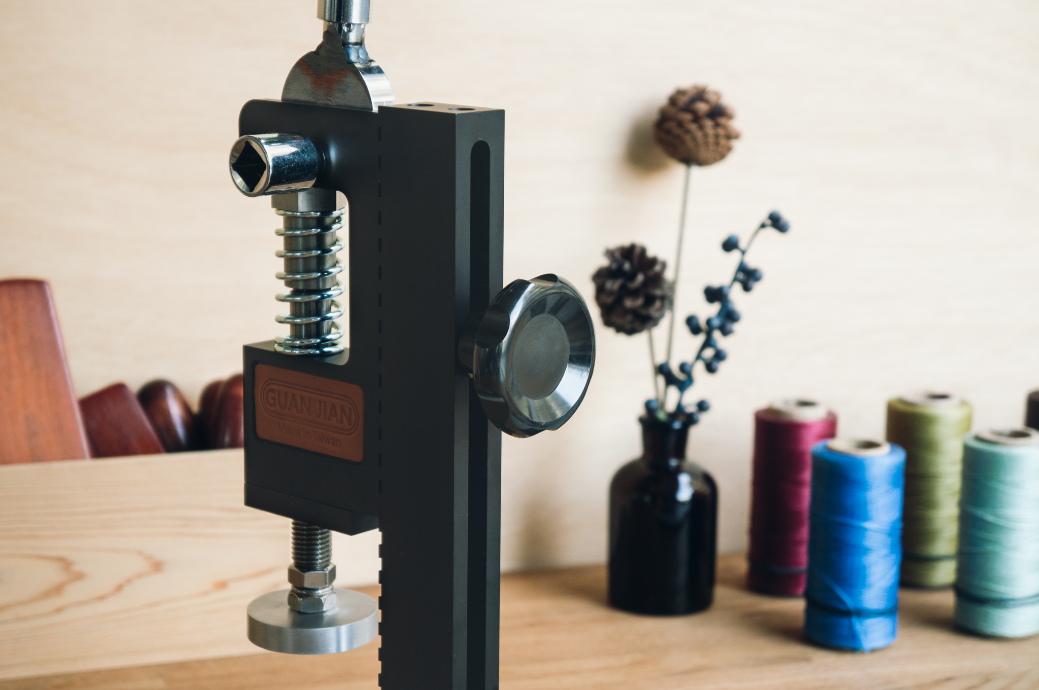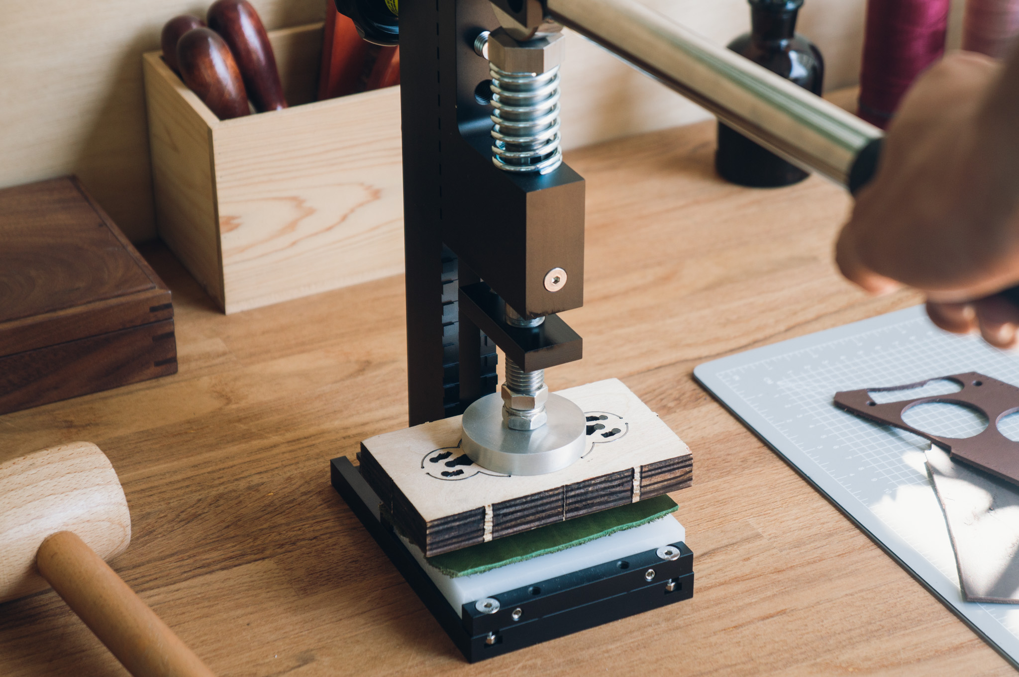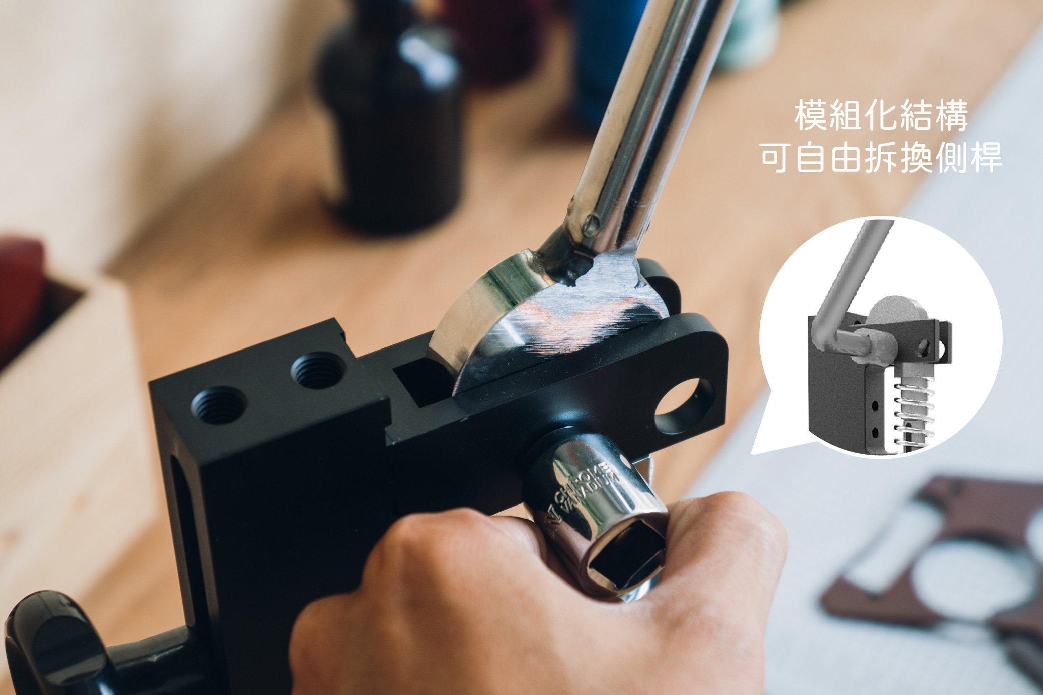 關鍵工具室是來自台灣在地的專業品牌,專門研發各式皮革相關工具,所做出的工具都獲得許多專利。這次牳瑪向關鍵工具室引進展示的 MT1 手壓台,是由台灣設計生產製造,模具大小適合皮革小物刀模與銅模壓印,甚至能壓斬孔,專利的模組化設計也能自由拆換許多配件。