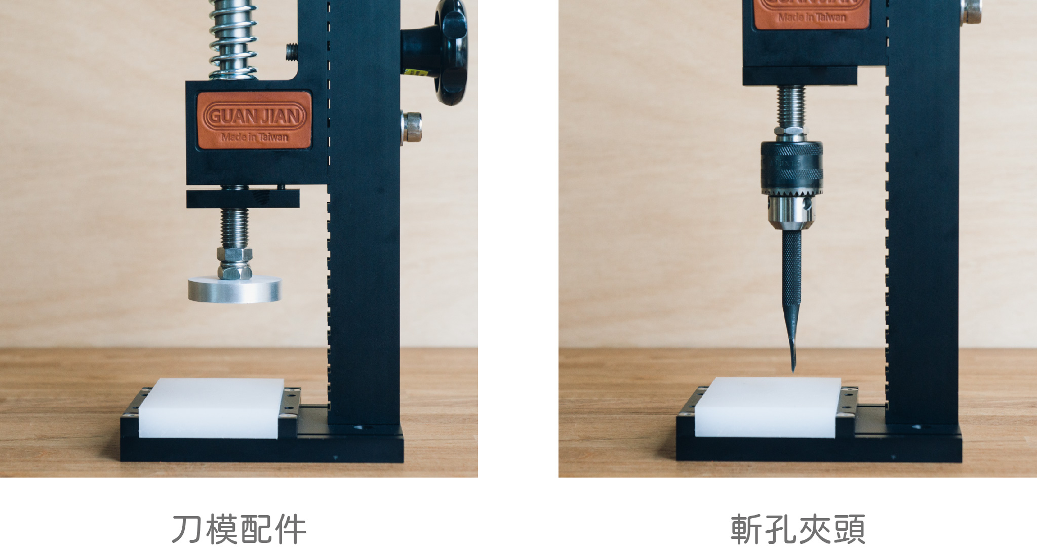 以往都必須用敲的才能將斬孔打穿,但每次敲打都會發出聲響,這對半夜才有靈感的我來說,做事起來非常綁手綁腳,雖然壓斬的速度不比打斬,但對於稍縱即逝的靈感來說已經足矣。這裡示範的是加購的 3 分夾頭(1.5-10 mm),夾入斬之後輕鬆一壓就能壓出漂亮的斬孔了!