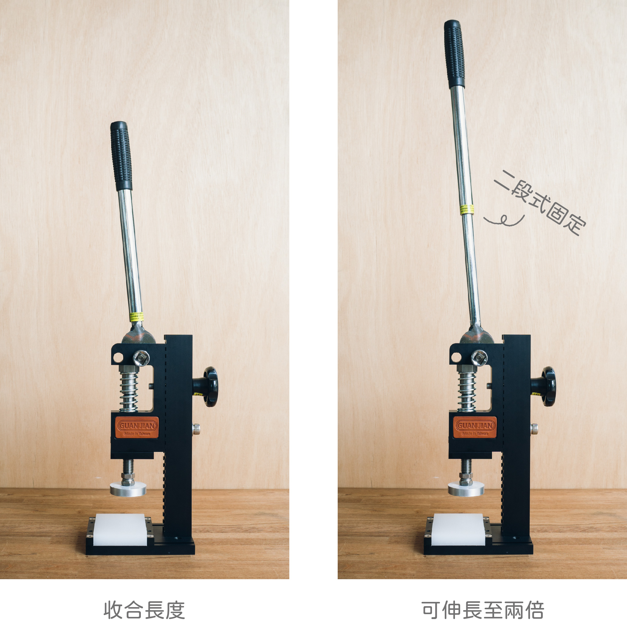 獨特壓桿設計可以自由伸長至適合的長度,桿子採用二段式固定,最長可以伸長兩倍(約 45 公分),桿子伸得越長能壓得越輕鬆,力氣小的皮友們不用再擔心壓不下刀模囉!