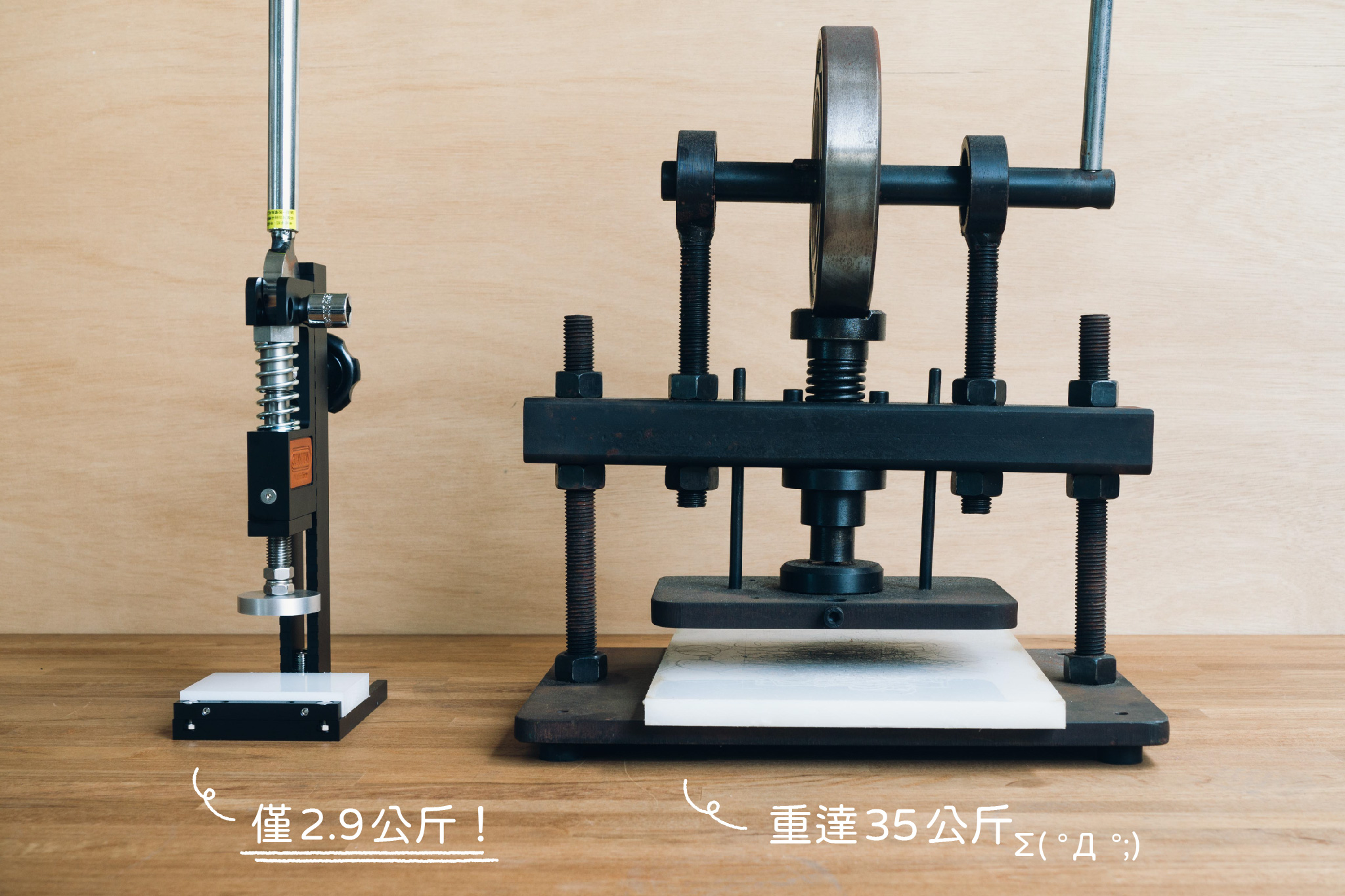與傳統的手壓台相比,在外型上也簡約許多,更符合現代的審美,重新設計的結構省去所有不重要的重量與部件,並使用 T6061 航太鋁合金,重量僅 2.5–3 公斤(依照配件重量而定)縮小了體積與重量,但功能性依然不減,甚至還更方便好用!