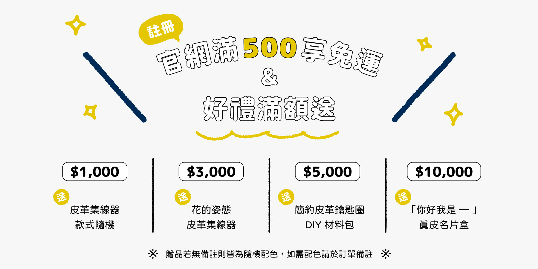 單筆贈品只能擇一,選低價的不補差價。 例:如果滿 $5000 以上,但不喜歡簡約皮革鑰匙圈也可以選花的姿態-集線器。材料包顏色請參考商品頁並將配色備註訂單備註欄。
