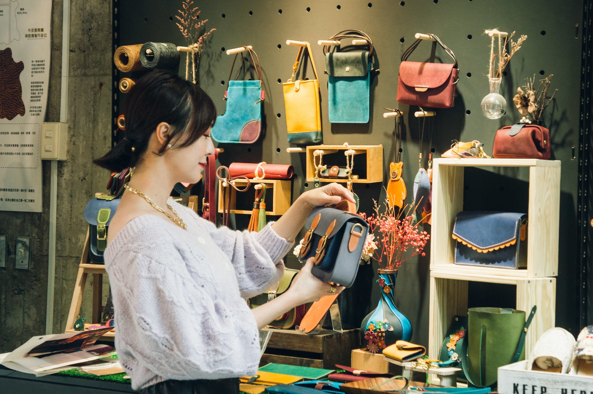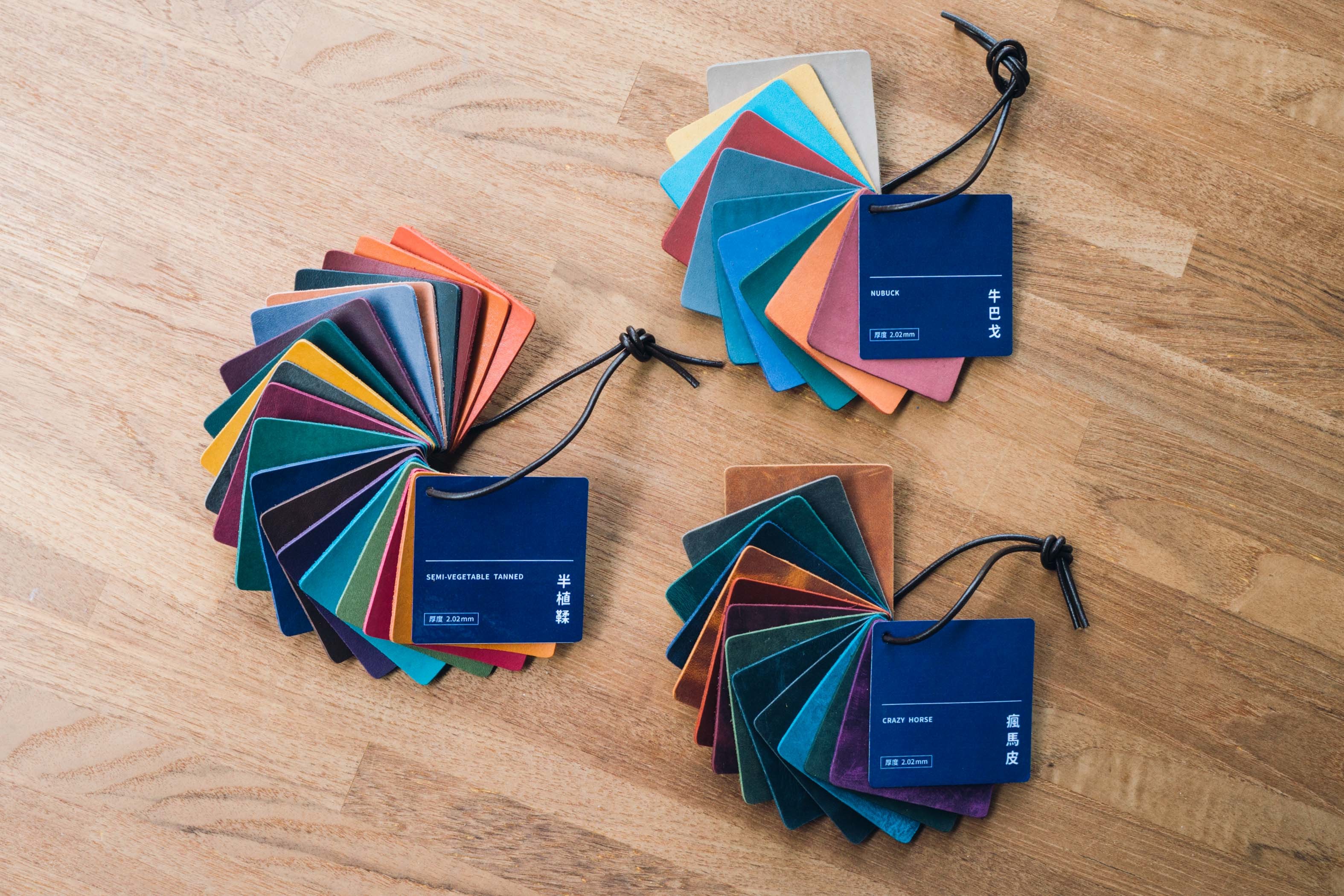 牳瑪在神農街的展售點除了完成品款式,也能接受配色客製,現場備有皮革色卡可以挑選,只要將希望的配色告訴 Demo Space 的工作人員就能現場預定。而工作室所有的包款皆有成品與材料包,而每個包款都有 18 色以上可以選擇(少數包款除外),無論是撞色或是同色都能自己搭配。