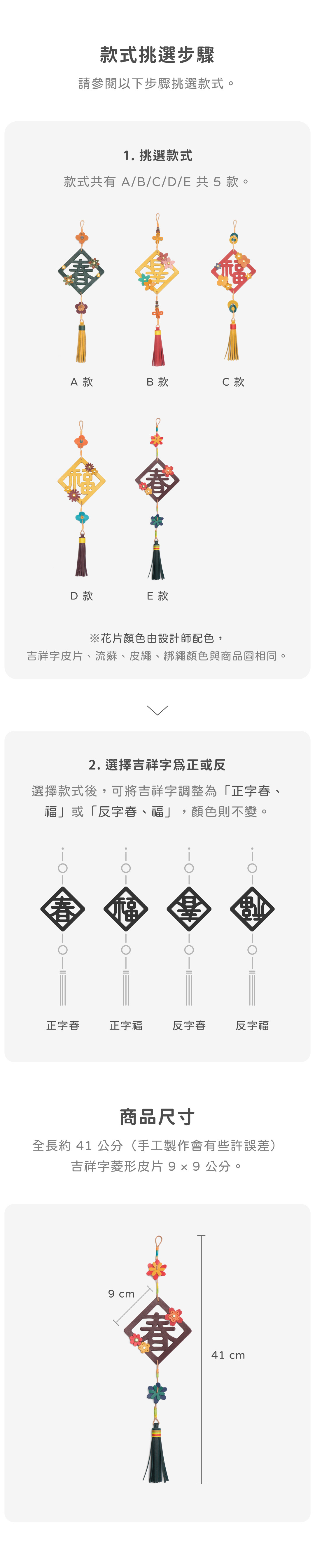 ※春、福主皮片、流蘇、皮繩、綁繩顏色與商品圖相同,花片飾片顏色將由設計師配色(造型不變),購買時還請注意喔!